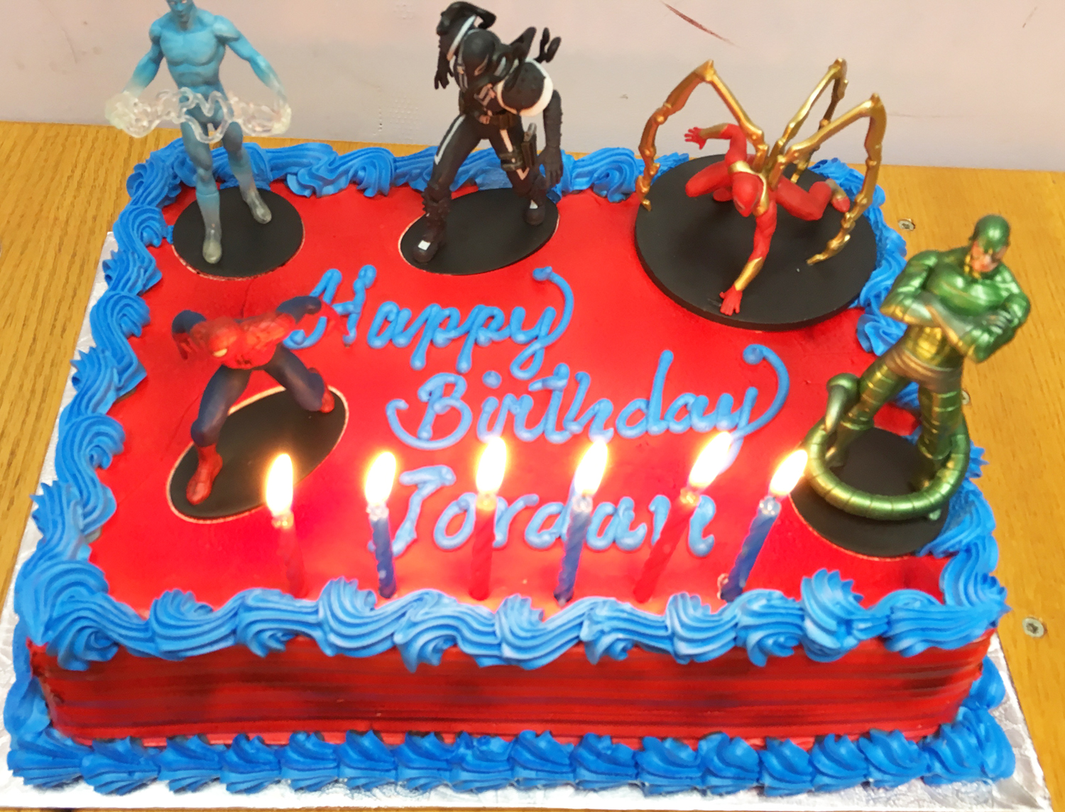 When it is cake time we invite kids back to the table, dip the lights and turn on a PERSONALIZED HAPPY BIRTHDAY SONG for our special person of the day! The SPIDERMAN Themed Cake is brought out by Spidergirl to the Happy Birthday song and placed in from of the birthday child. Spider girl then invites all kids and parents to sing Happy Birthday all together.